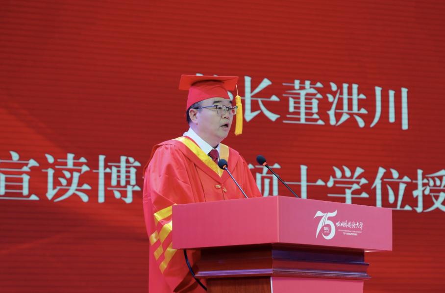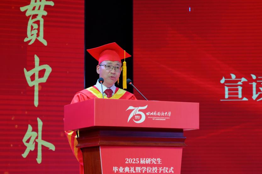 董洪川向2025届毕业研究生致以最热烈的祝贺。他高度肯定了同学们在校期间取得的优异成绩和为学校发展做出的贡献。董洪川指出,今年是学校建校75周年,782名研究生学子完成学业奔赴新程,既是个人青春里程碑,更是母校发展的见证人。临别之际,他以三点期许寄语毕业生: