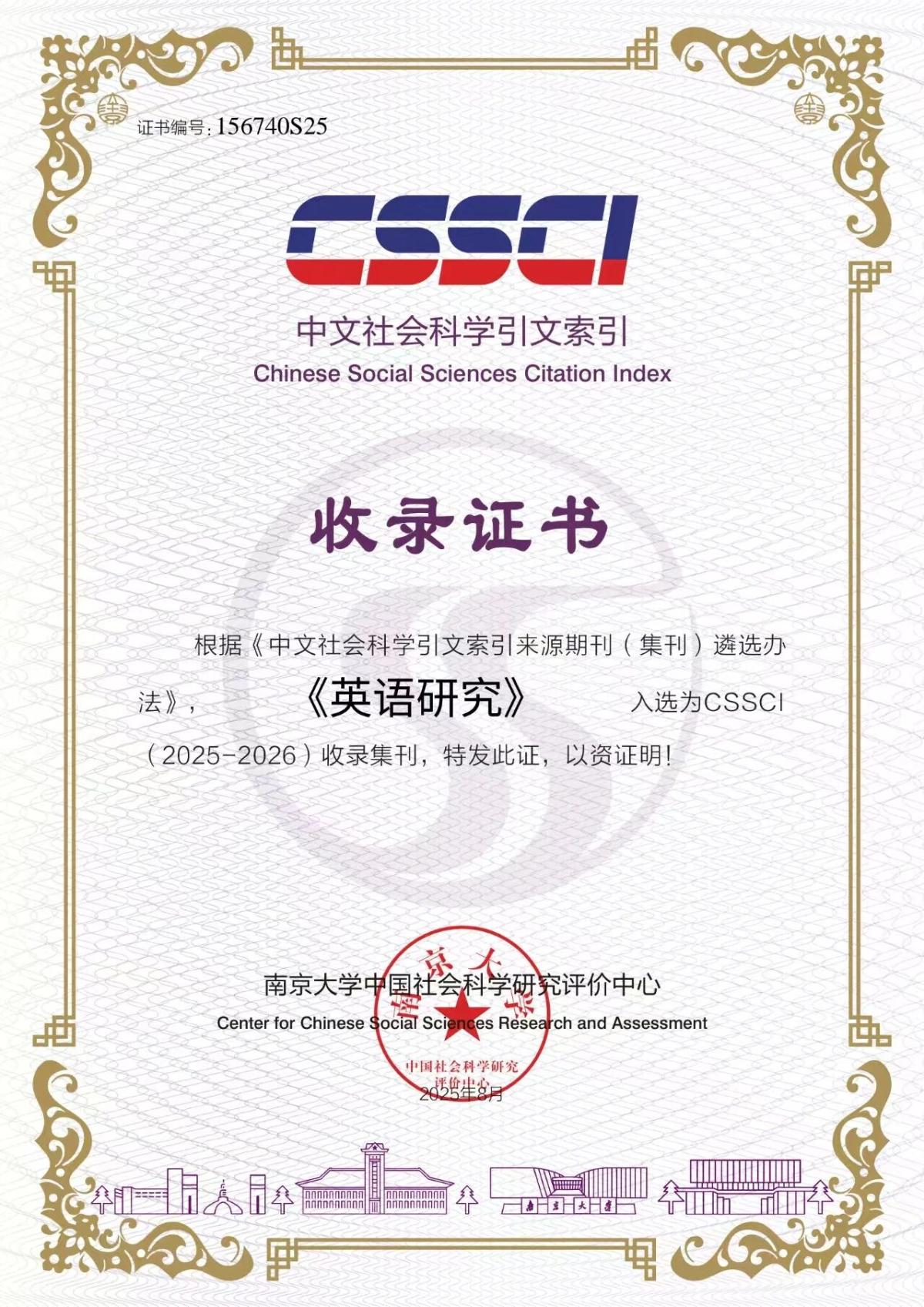 我校《英语研究》再次入选CSSCI(2025-2026)集刊,这是自2017年以来连续入选。
